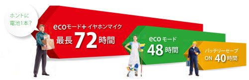 消費電力を抑えるバッテリーセーブ機能に新搭載した「ecoモード」により、単3形アルカリ乾電池1本でクラス最長48時間以上のロングランを達成。