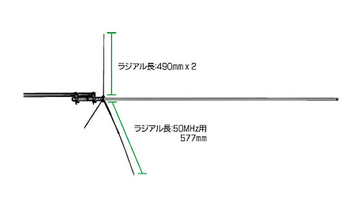 ●周波数:50MHz:3dBi、144MHz:6.2dBi、430MHz:8.6dBi ●耐入力:300W SSB ●ワイド受信100〜170/350〜470MHz ●全長:2.42m ●重量:1.4kg ●耐風速:50m/sec. ●50MHz帯に調製エレメントを標準装備(調製範囲:50〜53MHzの間の1.2MHz) ●適合マスト径:30〜62φ